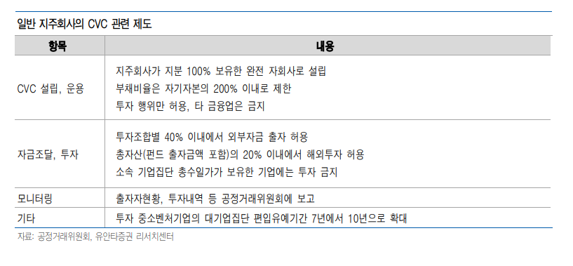 이승웅 유안타증권 연구원은 "외부자금에 대한 제약이 완화되는 경우 모회사뿐만 아니라 외부 투자자(LP)의 자금 유치가 추가적으로 가능해지며 CVC의 위탁운용사(GP) 역할 수행이 가능해질 것"이라며 "수천억원에서 조단위의 초대형 펀드 조성, 유망 스타트업에 대한 스케일업 투자 확대가 가능하다"라고 말했다.