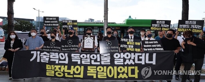 지난 2024년 9월 27일 '벤츠 EQ 파라시스 기망판매 비상대책위원회' 관계자들이 27일 오후 메르세데스-벤츠 코리아 본사가 입주한 서울 중구 서울스퀘어 앞에서 벤츠가 일부 EQE 전기차에 중국 파라시스 배터리를 탑재해놓고 소비자들에게는 CATL 배터리를 장착했다고 알렸다며 이를 규탄하고 있다. (사진=연합뉴스) |