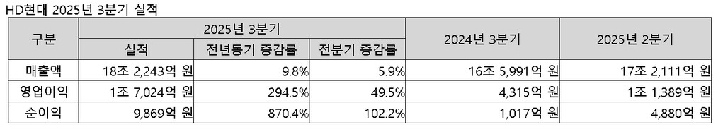 [알파경제=김영택 기자] HD현대가 3분기 연결 기준 매출 18조 2243억 원, 영업이익 1조 7024억 원을 기록하며 전년 동기 대비 각각 9.8%, 294.5% 증가하는 호실적을 달성했다고 3일 공시했다.