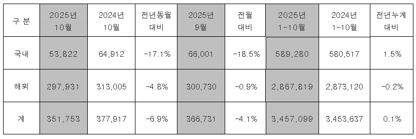 [알파경제=차혜영 기자] 현대자동차는 2025년 10월 전 세계 시장에서 총 35만 1753대를 판매하며, 전년 동월 대비 6.9% 감소세를 기록했다.