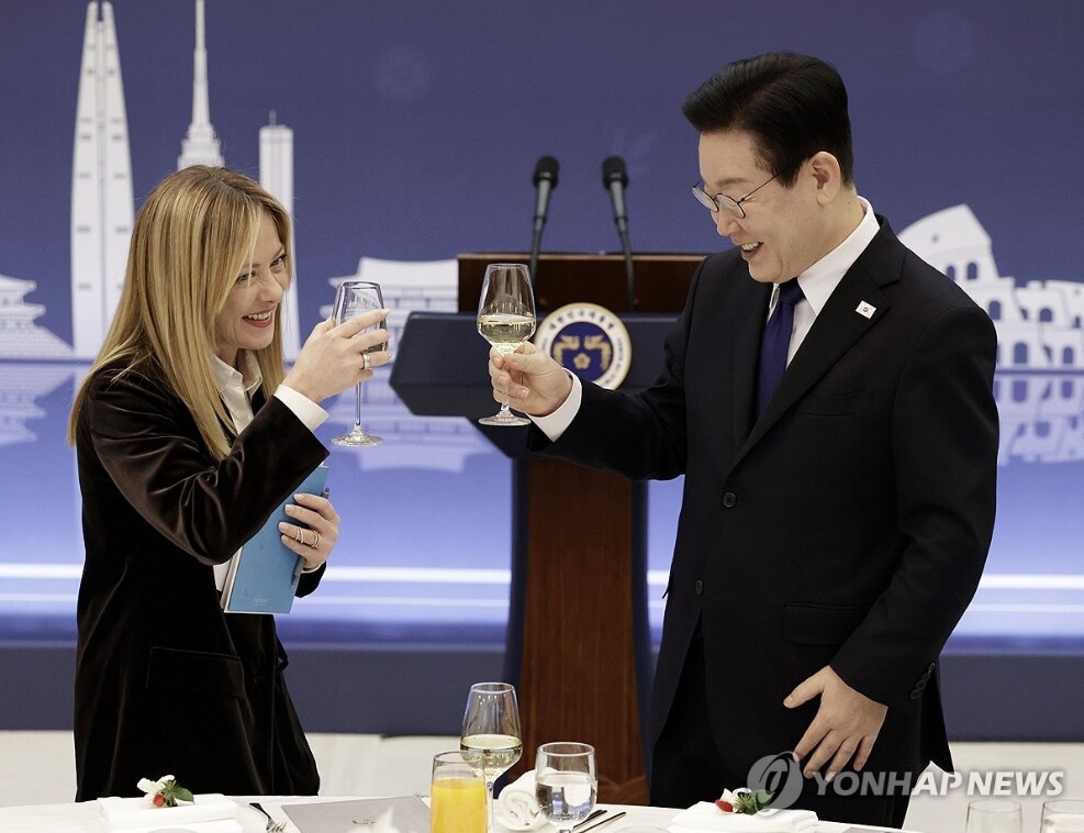 | 이재명 대통령과 조르자 멜로니 이탈리아 총리가 19일 청와대에서 열린 공식 오찬에서 건배하고 있다. (사진=연합뉴스) |