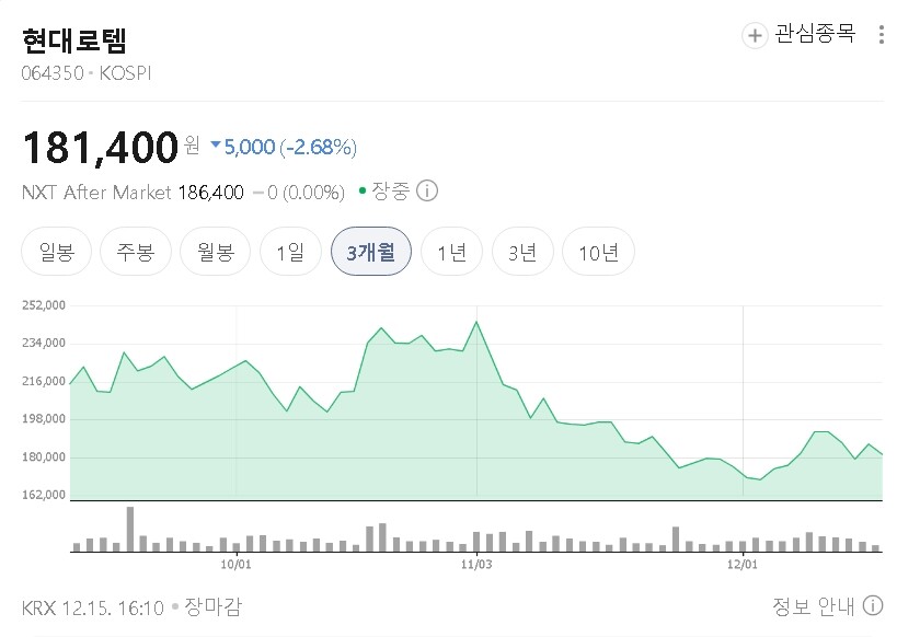 [알파경제=김교식 기자] 15일 인공지능공시분석 프로그램 타키온월드에 따르면 현대로템은 이날 2.68% 하락한 18만1400원에 마감했다.(한국거래소 기준) 하지만, 조만간 현대로템 주가는 반등할 전망이다.