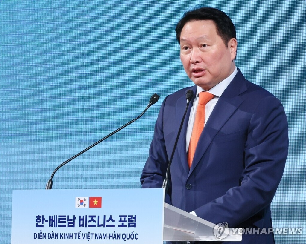 최태원 대한상의 회장이 12일 서울 중구 롯데호텔에서 열린 한-베트남 비즈니스 포럼에서 개회사를 하고 있다. (사진=연합뉴스)