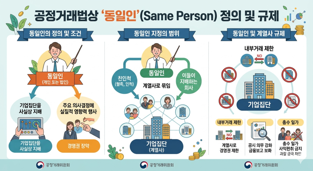 공정거래법상 동일인은 기업집단을 사실상 지배하는 주체를 의미하며, 동일인으로 지정될 경우 해당 기업은 공정위의 엄격한 규제 체계 아래 놓이게 된다.