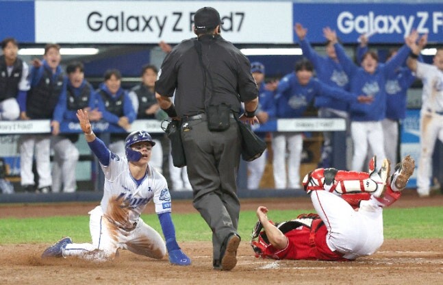 14일 대구 삼성 라이온즈 파크에서 열린 2025 프로야구 KBO 리그 포스트 시즌 준플레이오프 4차전 SSG 랜더스와 삼성 라이온즈의 경기. 6회말 무사 주자 1, 2루 상황에서 삼성 디아즈의 타격때 김성윤이 홈으로 슬라이딩 후 심판을 바라보고 있다. 사진=연합뉴스
