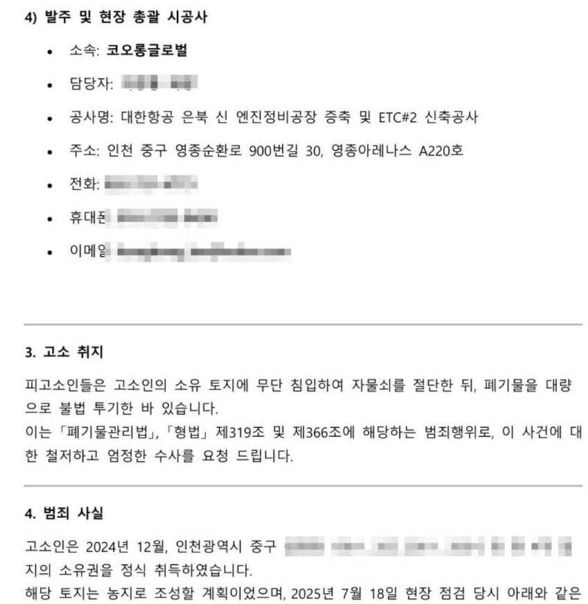 해당 토지 소유자는 SNS를 통해 “제 땅에 25톤 트럭 500대 분량의 폐토사가 불법적으로 매립되어 있는 것을 몇 달 전 확인했다”면서 “인근 CCTV를 탐문해 추적해 보니 영종도 내 대한항공에서 발주한 대규모 공사현장에서 발생한 토사였다”고 주장했다.