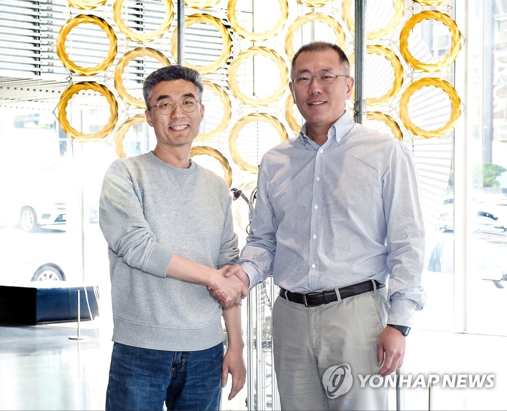 Hyundai Motor Group Executive Vice Chairman Euisun Chung (right) and CODE42 CEO Chang-Hyun Song pose for a commemorative photo after their meeting at Hyundai Motorstudio Seoul in Nonhyeon-dong. April 15, 2019. |