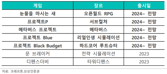 오동환 삼성증권 연구원은 “일부 신작의 개발 중단으로 23년에는 대작 출시가 없는 상황”이라면서 “올해 서브노티카의 후속작 출시나, 신규 개발사 인수를 통한 신작 출시는 가능할 수 있으나 매출 기여는 크지 않을 것으로 예상된다”고 말했다.