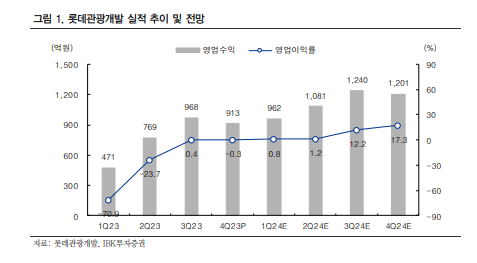 IBK투자증권에 따르면, 2024년 롯데관광개발의 카지노 매출액은 약 2700억 원으로 전년대비 76.0% 증가하고 영업이익은 약 940억 원으로 추정된다.