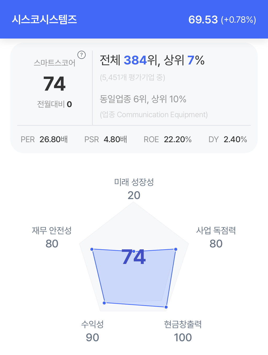 시스코 주가는 69.53달러로 0.78% 상승 마감했다.