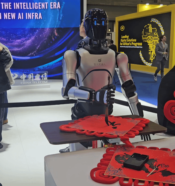 차이나텔레콤 부스에서는 로봇이 한자를 써 내려가는 장면이 관람객의 발길을 붙잡았다. 붓털이 종이에 닿을 때마다 주변에서는 감탄사가 쏟아졌다.