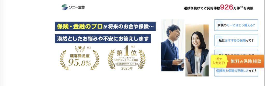 소니생명은 1979년 미국 프루덴셜과의 합작회사로 출범했으며, 이후 계약을 끝내고 독자 운영 체제로 전환했다. 대학 졸업 남성이 주축을 이루는 영업조직인 ‘라이프 플래너’ 모델로도 알려져 있다. 라이프 플래너 수는 2025년 3월 말 기준 5,795명이다.