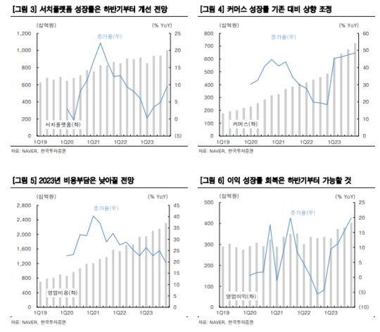 정호윤 연구원은 "경기 회복과 관련된 불확실성이 아직 존재하지만 하반기로 갈수록 광고와 커머스의 매출 성장률은 회복될 것으로 전망하며 비용 효율화를 통해 이익 규모 또한 확대될 것"이라며 "생성형 AI의 등장 이후 빅테크들에 의한 국내 검색 시장의 잠식 가능성이 대두되었고 이에 따라 주가 또한 조정을 받았으나 단기에 그런 일이 일어날 가능성은 제한적이라고 판단, 밸류에이션 부담이 낮아 매수에 나설 시기"라고 조언했다.