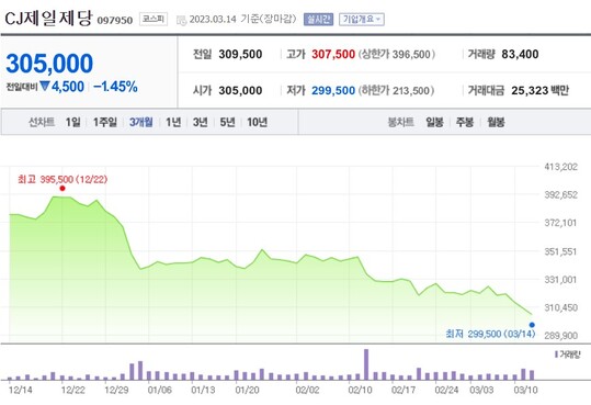 | CJ제일제당 주가 추이 (출처=네이버증권) |