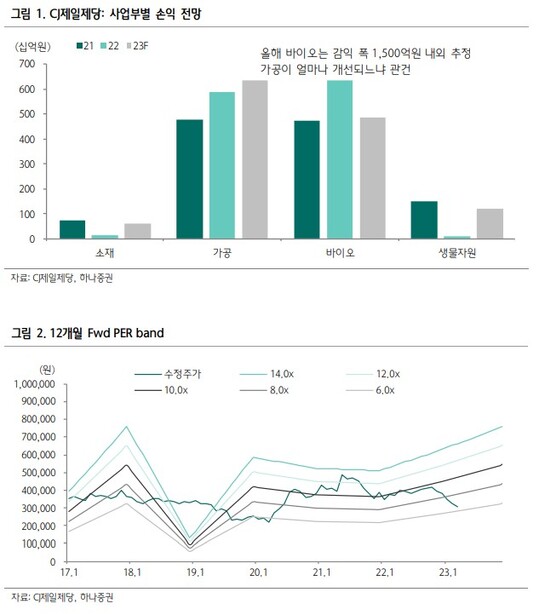 CJ제일제당의 주가는 작년말 대비 20% 가량 하락했다. 심은주 하나증권 연구원은 "현 주가는 12개월 포워드 PER(주가수익비율) 6배에 거래 중으로 역사적 밴드 하단에서 거래되고 있다"며 "CJ제일제당에 대한 우려는 주가에 기반영되어 있다"고 판단했다.