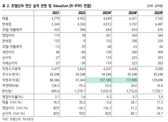 서현정 연구원은 "협상력 제고에 따라 호텔신라의 이익 개선 폭은 예상보다 클 수 있다"며 "현재 주가 12개월 선행 PER(주가수익비율) 20배로, 지금은 밸류에이션보다 높은 실적 모멘텀에 더 주목할 때로 비중확대가 유효하다"고 조언했다.