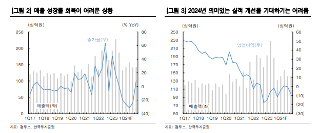 전방 시장인 국내 모바일게임 시장의 성장률 하락, 그리고 컴투스의 신작 라인업을 감안할 때 2024년 실적 개선 가능성이 높지 않다는 판단이다.