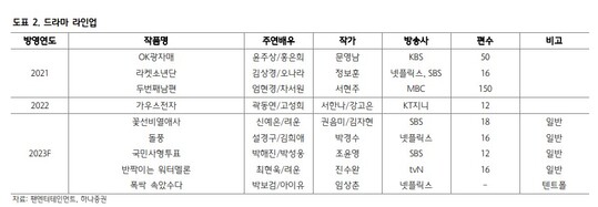 이기훈 하나증권 연구원은 "방송사의 부진한 광고 업황과 OTT의 비용 통제 기조로 편성에 대한 우려가 있는 만큼 S급 작가,감독,배우로 구성된 소수의 텐트폴 작품에 대해 긍정적인 모멘텀으로 작용할 것"이라며 그 외에도 설경구와 김희애 주연의 넷플릭스 오리지널 '돌풍', 박해진과 박성웅 주연의 웹툰 원작 드라마 '국민사형투표(SBS)', 려운과 설인하 주연의 판타지 로맨스 '반짝이는 워터멜론(tvN)' 등의 작품들이 준비되어 있다"고 전했다.