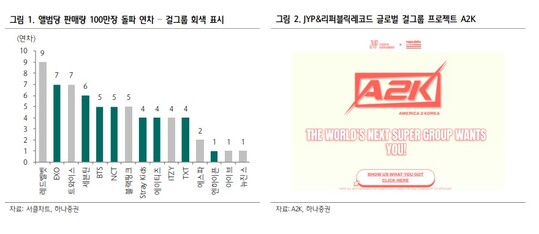이기훈 연구원은 "올해 하반기에는 한국 남자, 중국 남자, 그리고 미국 여자 등 총 3팀이 데뷔하는데 이 중 미국 여자 신인 그룹 데뷔가 가장 중요한 모멘텀이 될 것"이라며 "하이브는 게펜 레코즈와 JYP는 리퍼블릭 레코즈와 함께 일명 A2K 프로젝트로 미국 걸그룹을 준비하고 있다"고 전했다.