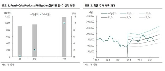 지난 2022년 필리핀 팹시의 매출액 및 순이익은 각각 9087억원과 8억원을 시현했다. 하나증권은 올해 매출액 및 순이익을 각각 9632억원, 135억원으로 전망했다.