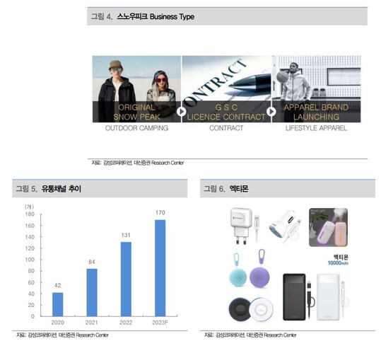 신석환 대신증권 연구원은 "올해 S/S 스타일 수는 180개로 증가했고, 여성 및 키즈 라인업 확대는 기존의 스노우피크 성인브랜드에서 추가적인 매출 성장 요인"이라며 "동사는 자사몰을 포함한 9개의 온라인 판매처 보유했고 온라인 매출의 대부분은 자사몰에서 발생했으며 올해 2월 무신사와 파트너스 계약 체결을 통해 브랜드 인지도 및 온라인 매출 극대화 가 전망된다"고 전했다.