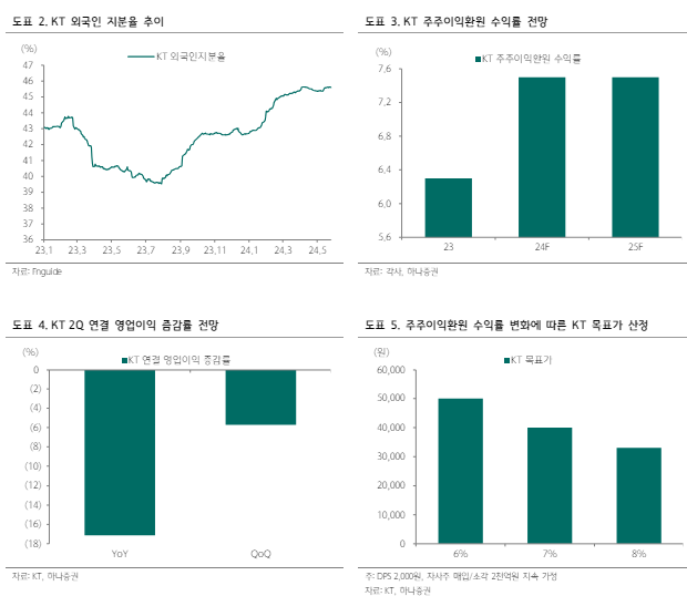 실적 부진 전망에도 불구하고 5월 이후 KT 경영진들이 시장 기대치를 상회하는 주주 친화적인 정책을 펴고 있는 있어 투자 심리가 다소 개선되는 가운데 KT 주가 바닥이 다소 높아지는 형태를 띨 가능성이 높아 보인다는 판단이다. 이에 투자의견 중립과 목표주가 3만9000원을 유지했다.