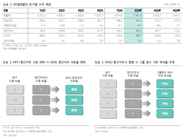 김홍식 연구원은 "하이닉스 배당은 SK-SK스퀘어간 합병 이후에나 유의미한 변화가 나타날 것인 반면 SKT 배당금은 당장 높은 수준으로 유지되어야 하기 때문에 모든 가능성을 열어 놓고 봐도 본 이슈는 SKT에엔 호재임이 분명하다"고 강조했다. 이에 투자의견 매수와 목표주가 7만원을 유지했다.
