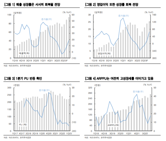정호윤 한국투자증권 연구원은 "1분기에 이어 2분기에도 플랫폼 매출액의 회복이 이어진다는 점이 고무적"이라며 "작년 하반기 구글의 결제정책 변경 이후 플랫폼 매출액은 지난해 4분기 기준 542억원까지 하락했으며 이익 창출의 핵심인 플랫폼 사업의 부진으로 주가와 밸류에이션이 모두 사상 최저 수준까지 하락했지만 핵심 결제유저층을 기반으로 ARPPU(유료사용자 1인 평균 결제금액)가 여전히 상승 추세에 있으며 1분기부터 우려 요인이었던 PU(유료결제 이용자) 또한 반등이 확인됐다"고 전했다.