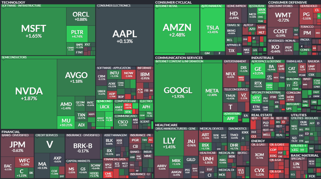 마이크론은 10.21% 폭등했고, 엔비디아는 1.79%, 팔란티어는 4.74% 뛰었습니다. 알파벳은 1.91% 상승했고, 애플도 0.13% 상승했습니다.
