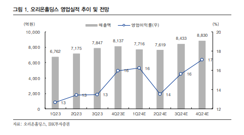 남성현 IBK투자증권 연구원은 5일 오리온홀딩스에 대해 "주력 사업부인 제과부문 영업실적이 가파르게 성장하고 있고, 영상사업부(쇼박스) 제작 편수 및 제작 역량 확대에 따른 효과가 나타나고 있다"고 분석했다. 배당수익 확대에 따른 영업실적 성장도 이루어지고 있다는 판단이다.