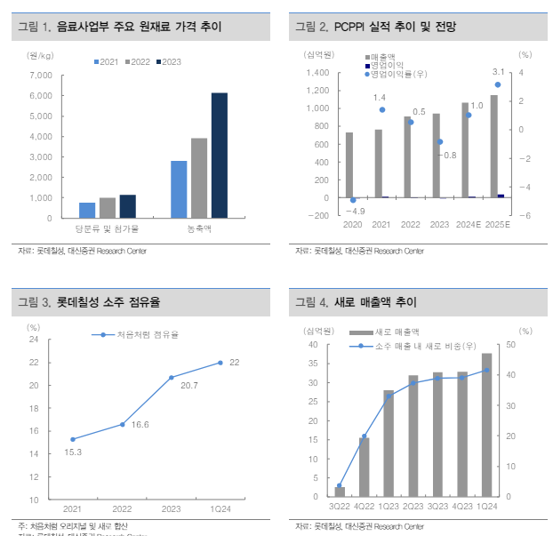 롯데칠성의 2024년 1분기 연결 매출액은 9369억 원으로 전년 대비 37.8% 증가했고, 영업이익은 424억 원으로 28.5% 감소하며 시장 컨세서스를 소폭 하회했다. 1분기 음료 사업부 영업이익률(OPM)이 전년 대비 3.7%포인트 하락하며 부진한 실적을 기록했다는 평가다.