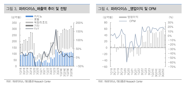대신증권에 따르면, 파라다이스의 2분기 연결기준 매출액은 2932억 원으로 전년 대비 6.5% 증가하고, 영업이익은 484억 원으로 전년 대비 10.8% 감소해 컨세서스 대비 9% 상회하는 호실적이 전망된다.