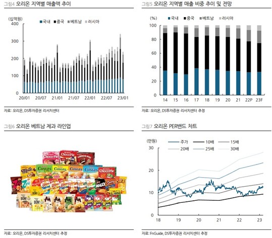 오리온의 중국 외 매출 비중은 지난 2015년 41%에서 2022년 56%로 확대되는 추세로 올해는 59%로 전망된다.
