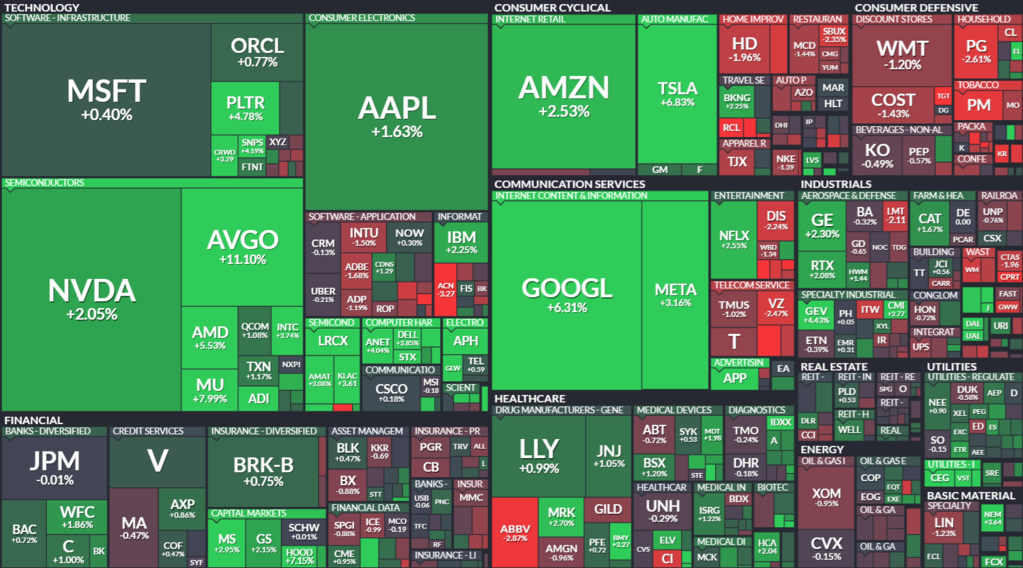 알파벳에 대한 기대감은 다른 AI 관련주로 확산되며 브로드컴은 11%, 마이크론테크놀로지는 8%, 테슬라는 6.8% 급등했습니다. 팔란티어는 4.8%, AMD는 5.5%, 메타는 3.2%, 엔비디아는 2.0%, 아마존은 2.5% 올랐습니다.