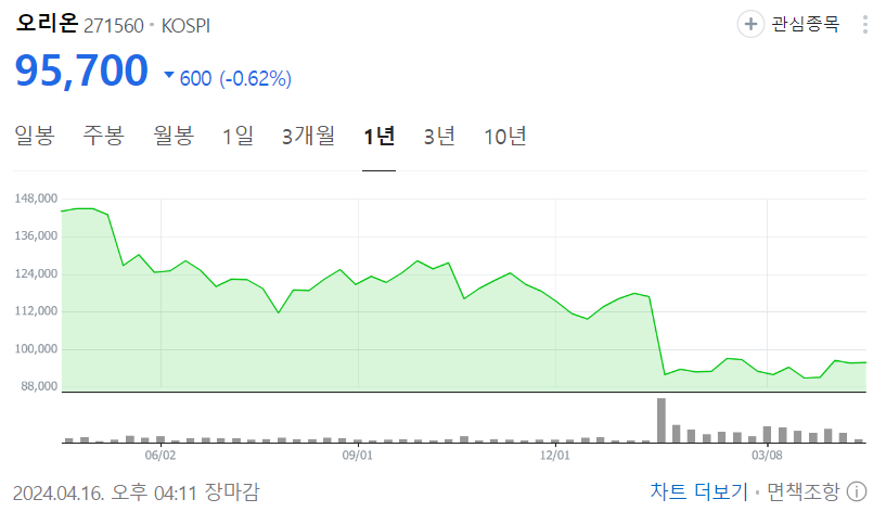 한국투자증권에 따르면, 오리온의 2024년 3월 법인별 합산 실적은 매출액 2308억 원으로 전년 대비 0.6% 늘었고, 영업이익은 392억 원으로 10.4% 증가했다. 원재료 가격 하락으로 제조원가가 감소했으며 판매량 증가, 비용 절감 등을 통해 영업이익률이 전년동기배비 1.5%p 상승했다.