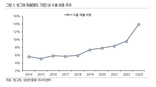 이어 수출의 확대 추이가 당분기에도 지속되어 처음으로 두 자릿수인 14% 비중을 상회한 점을 의미있게 평가하며 음식료 업종 내 최선호주로 유지했다.