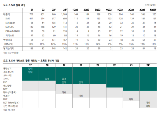 1분기에는 NCT드림, 라이즈(싱글), 에스파(싱글)의 컴백 및 NCT NEW TEAM의 정식 데뷔, 그리고 상반기 내 신인 걸그룹의 정식 데뷔가 예상된다.