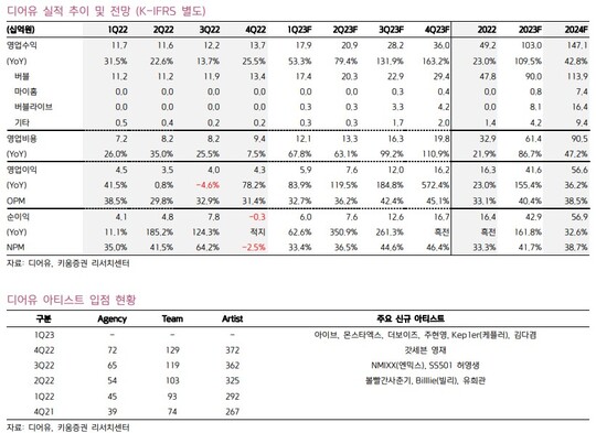 키움증권에 따르면, 디어유의 1분기 매출액은 전년 대비 53.3% 증가한 179억원, 영업이익은 83% 늘어난 59억원으로 추정돼 컨센서스에 부합할 것으로 보인다. 1분기 평균 구독수 레벨은 전년 대비 58% 늘어난 200만을 상회했을 것으로 예상된다.