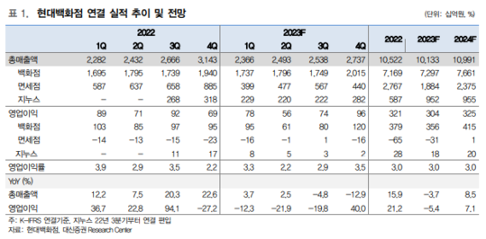 현대백화점의 지난해 4분기 총매출액은 2조7370억원으로 전년 대비 13% 감소했고, 영업이익은 960억원으로 전년 대비 40% 증가를 기록하며 컨세서스에 부합했다.