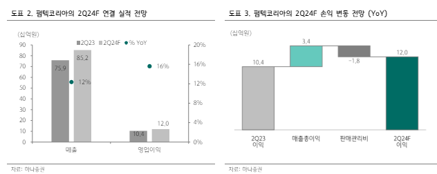 하나증권에 따르면, 펌텍코리아의 2분기 매출액은 852억 원으로 전년 대비 12% 증가하고, 영업이익은 120억 원으로 16% 늘어 분기 최대 실적 기록할 것으로 추정된다.