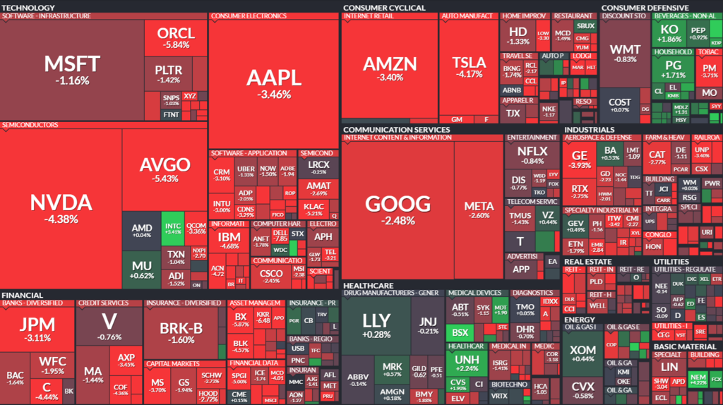 마이크로소프트가 1.16% 하락했고 애플은 3.46% 내렸습니다. 메타는 2.6%, 엔비디아는 4.32%, 테슬라는 4.18% 하락했습니다.