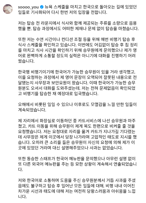 한편, 가수 소유 역시 최근 인종차별 논란에 휩싸였다. 소유는 19일 자신의 SNS를 통해 델타항공 탑승 당시 인종차별을 당했다고 주장했으나, 한 누리꾼이 소유가 만취 상태였다고 반박하며 논란이 증폭되었다. 소유는 이후 추가 입장을 통해 라운지에서 소량의 주류를 마셨을 뿐이며, 승무원과의 오해가 있었다고 해명하며 보상이나 폭로 목적이 아닌 재발 방지를 위한 글이었다고 밝혔다.