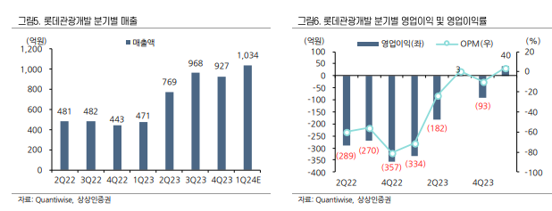 상상인증권에 따르면, 롯데관광개발의 올해 1분기 매출액은 1034억원으로 전년 대비 120% 증가하고, 영업이익은 40억원으로 흑자 전환할 것으로 추정된다.