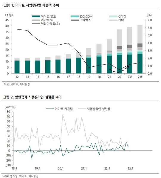 하나증권 자료에 따르면, 이마트의 올해 영업이익은 전년 대비 152% 늘어난 3663억원으로 실적 턴어라운드가 국면이 가능할 것으로 보인다. 고정비 부담이 큰 할인점은 비용 효율화와 PP센터 비중 축소 등으로 증익 국면을 이어갈 수 있는 상황이라는 분석이다. 트레이더스는 올해 7%의 매출 성장률을 예상하기 때문에 영업이익 740억원 수준이 가능할 것으로 전망된다. 스타벅스와 쓱닷컴, G마켓도 연결 기준 이익 개선 폭이 클 수 있어 1분기 연결 영업이익은 전년 대비 145% 늘어난 843억원으로 높은 실적 모멘텀을 이어갈 전망이다.