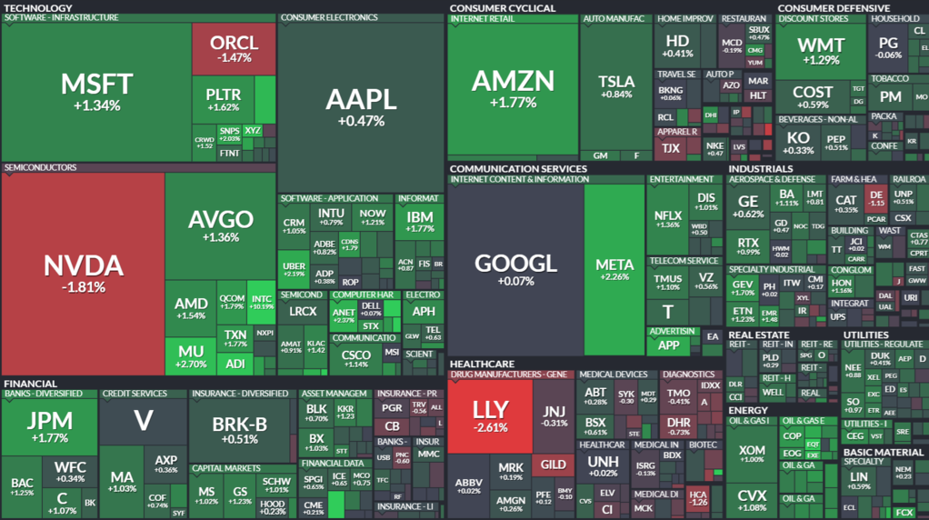 빅테크 중에서는 엔비디아만 1.8% 하락한 것을 제외하고 애플, 마이크로소프트, 알파벳, 브로드컴, 메타, 테슬라 등이 모두 상승했습니다.