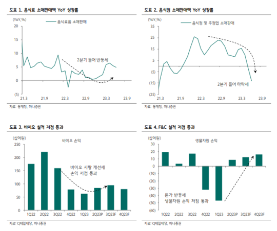심은주 하나증권 연구원은 "국내 가공은 내식 수요 이동 및 유통 제휴(네이버, 컬리 등) 등을 통해 물량 회복이 기대되고 해외 가공은 미주를 중심으로 매출 성장 및 마진 개선세가 이어질 것으로 전망된다"며 "바이오는 전반적으로 시황을 통과한 가운데, 중국 리오프닝 효과에 따른 실적 업사이드가 존재한다"고 분석했다. F&C도 전분기 대비 회복세가 이어질 것으로 예상된다.
