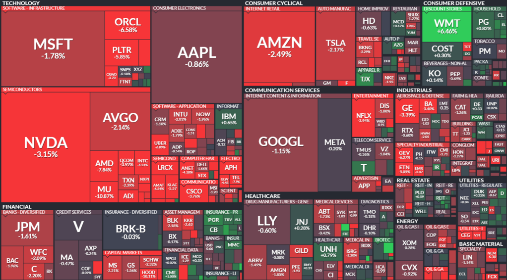 오라클이 6%, 팔란티어 5%, 로빈후드가 10% 급락하는 등 올해 급등했던 종목들을 중심으로 낙폭이 컸습니다.