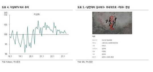 이기훈 연구원은 "드라마 편성을 쉬어가면서 제작비를 유연하게 집행할 예정이고, 연결 자회사에서는 스튜디오S의 디즈니+로 판매된 <낭만닥터 김사부3>의 효과가 반영될 것"이라며 "드라마는 연간으로 <악귀>, <7인의 탈출>, <소방서 옆 경찰서2> 등 텐트폴 및 시즌제 작품들이 대기하고 있어 연결 자회사들의 실적 기여도가 높아지면서 이익을 방어할 것"이라고 설명했다.