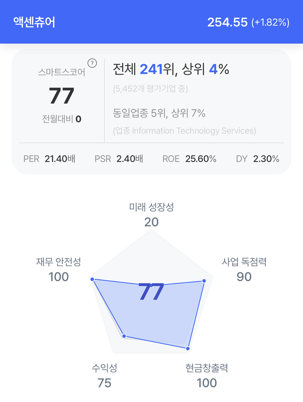 액센츄어 주가는 1.82% 상승 후 254.55달러로 마감했다.