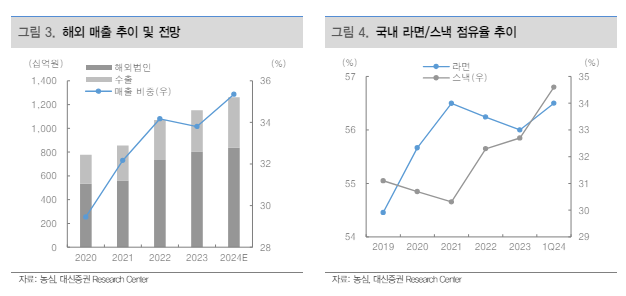 신라면, 짜파게티 등 주력 브랜드의 매출 성장이 지속되며 내수라면 매출은 전년 대비 2.2% 성장했다. 유럽, 동남아 중심으로 수출 매출이 고성장했고, 포테토칩, 빵부장 등 스낵 신제품 판매 호조로 국내 스낵 점유율 확대 지속되며 스낵 매출은 전년 대비 11.3% 성장했다.